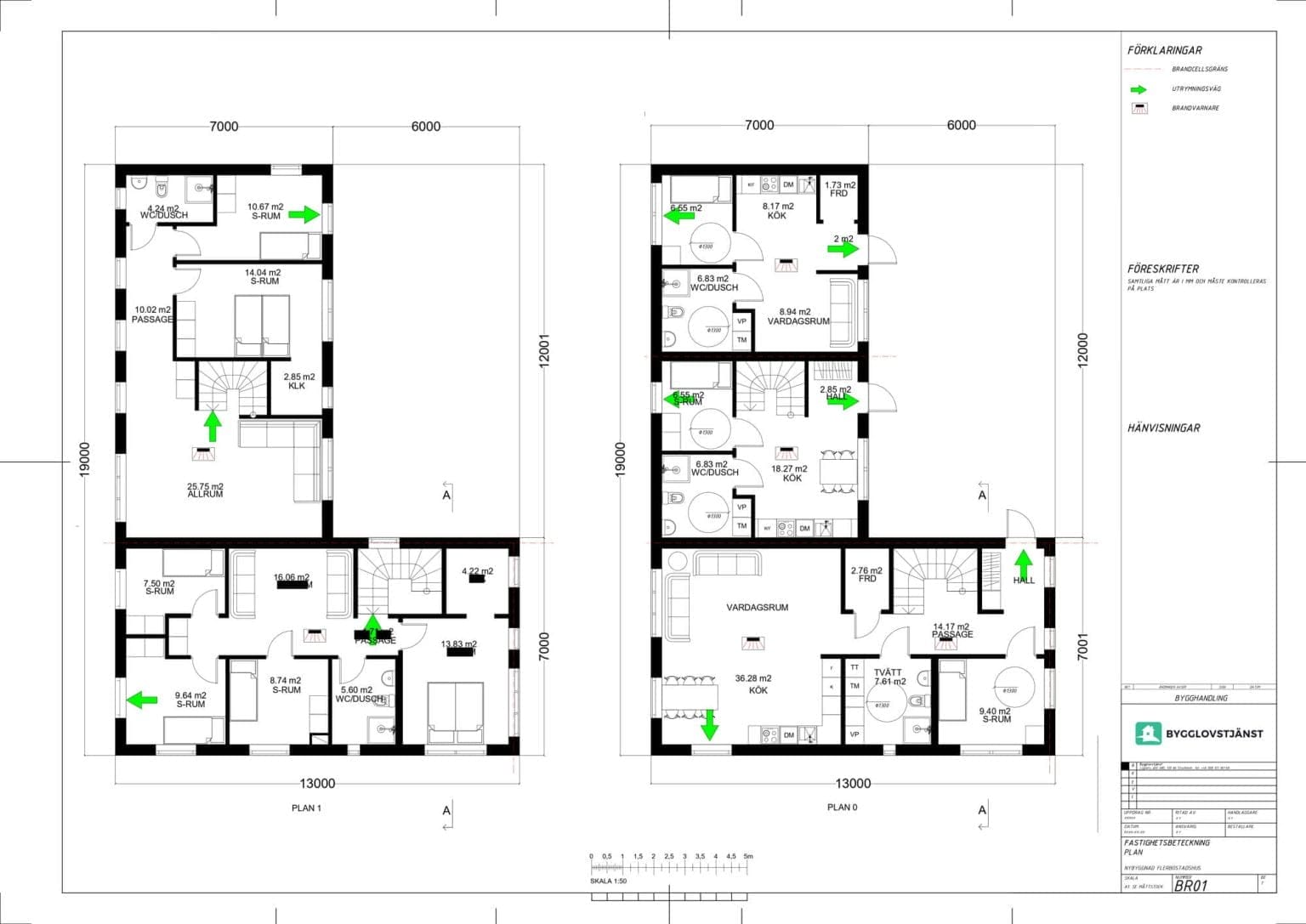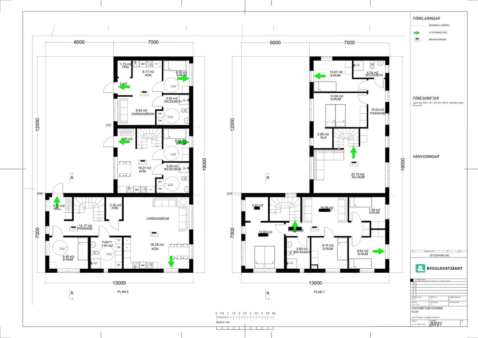 Evakueringsplan: En plan för hur människor i byggnaden ska evakuera på ett säkert sätt i händelse av brand, inklusive placering av nödutgångar och samlingsplatser.