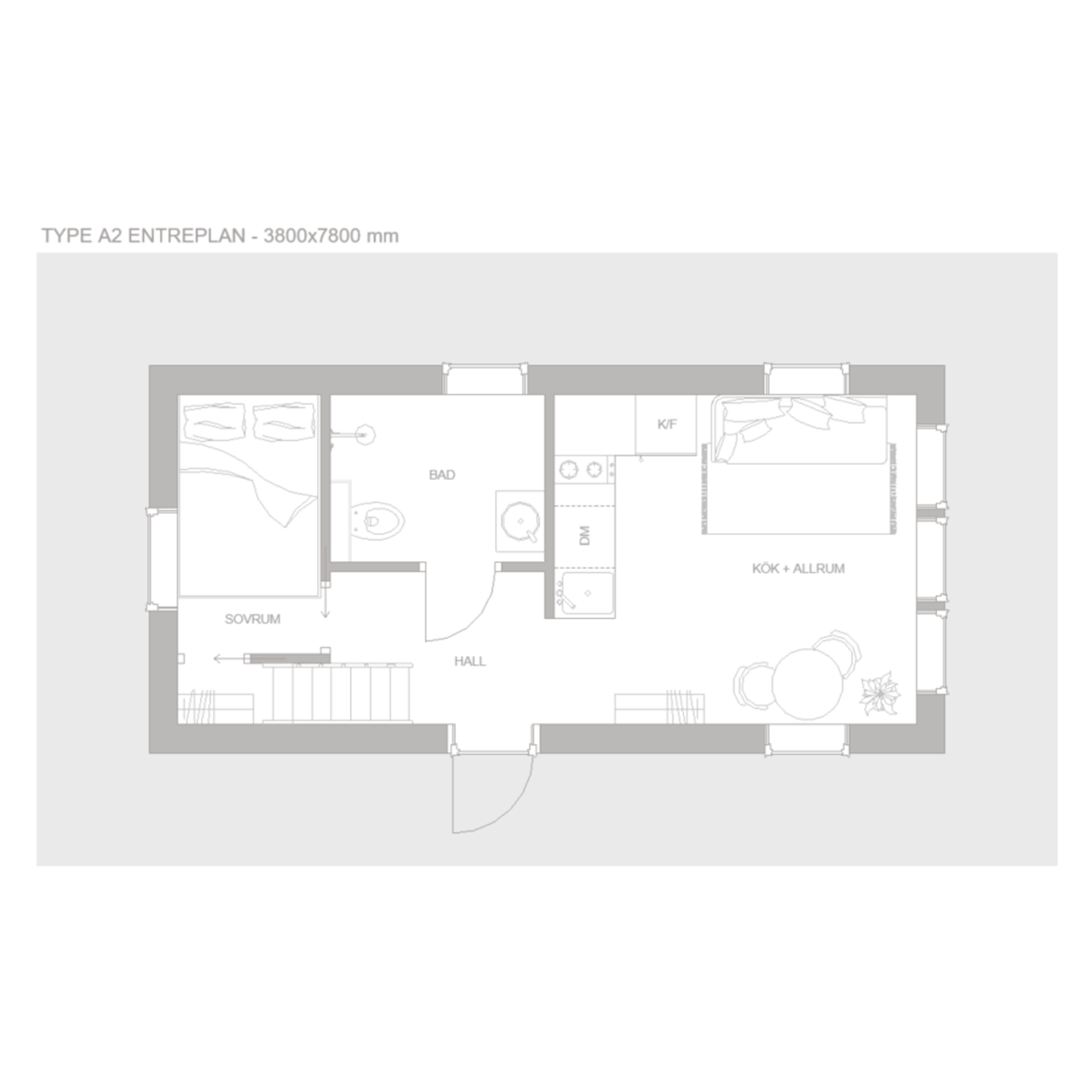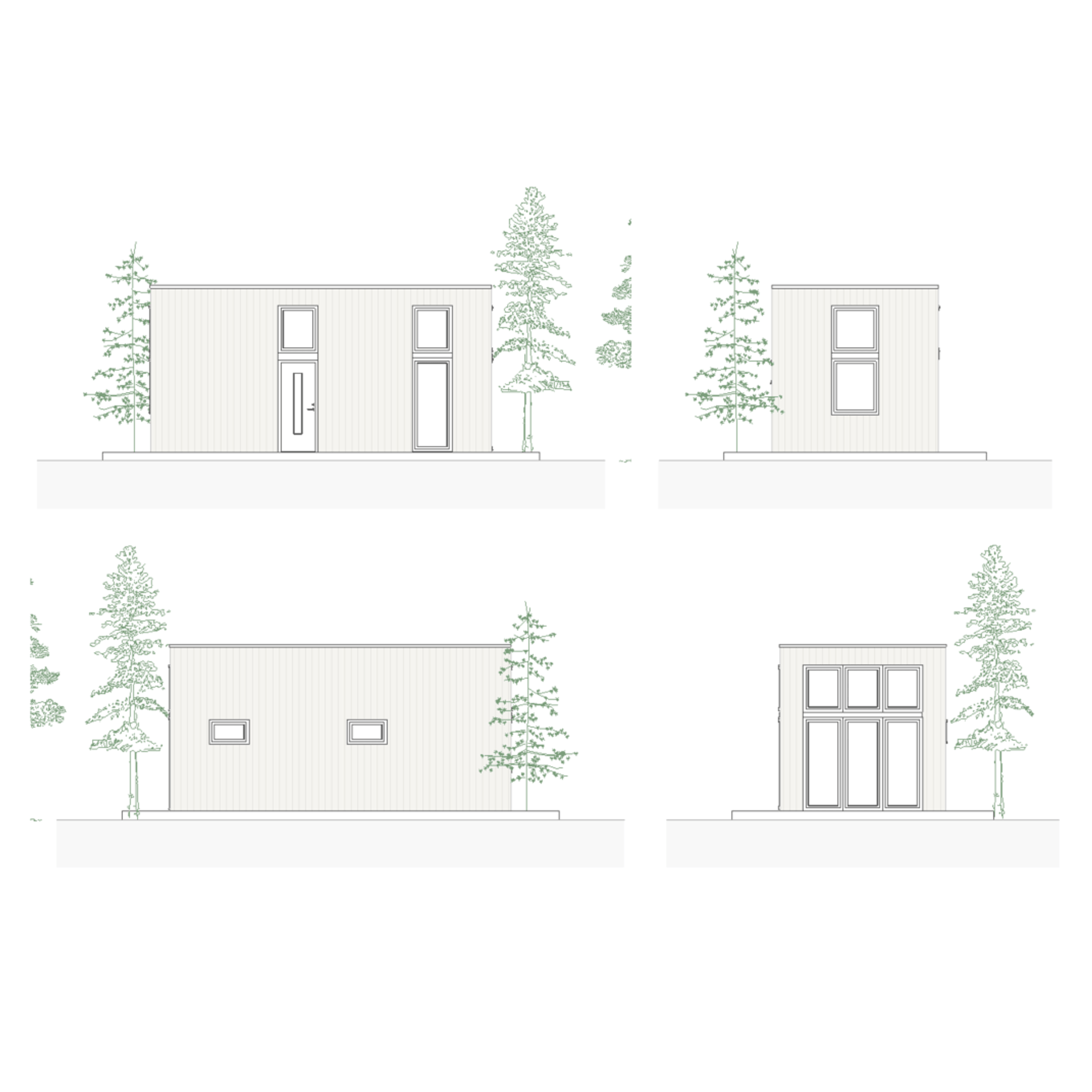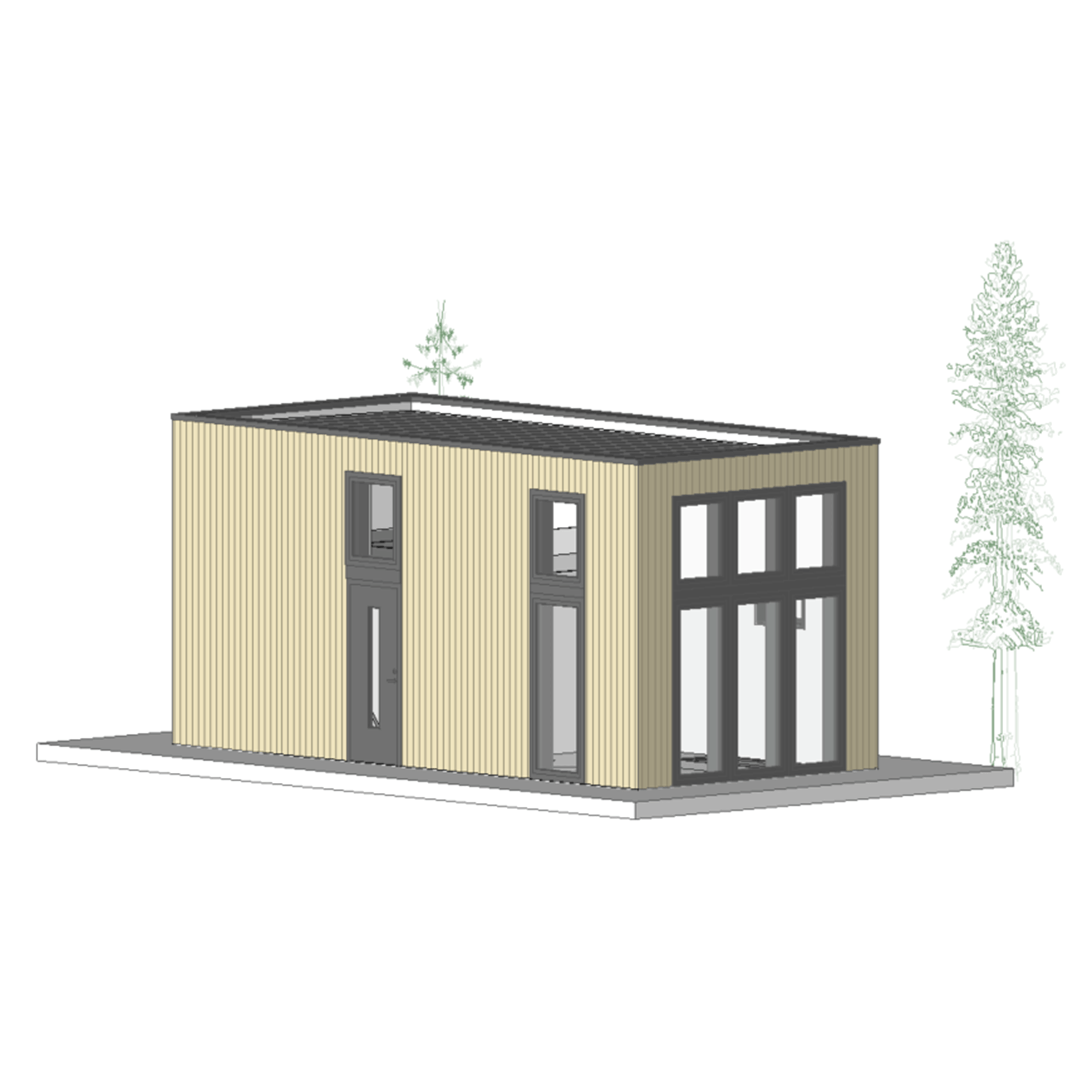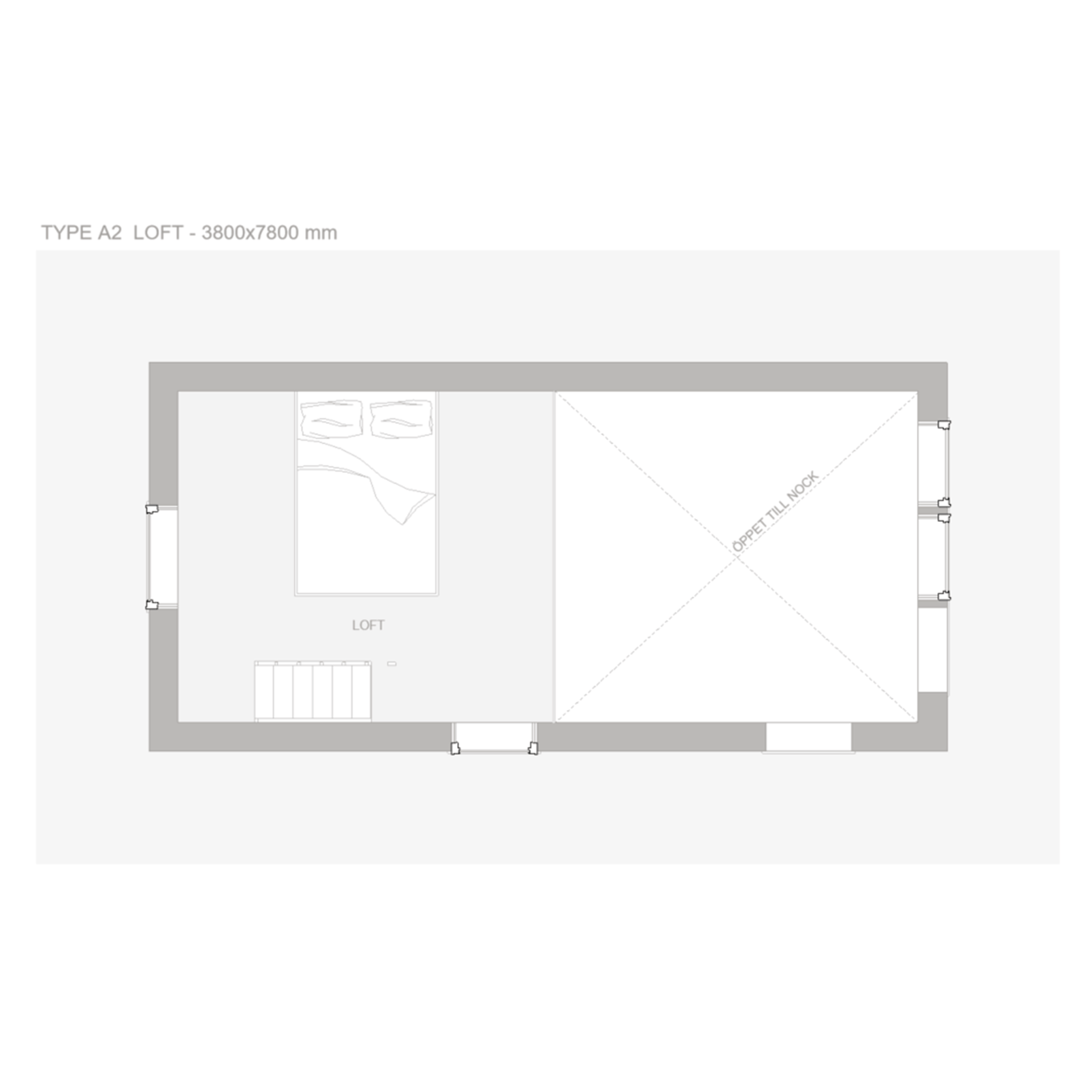Vårt Attefallshus Ella är ett Attefallshus med en modern look med höga smala fönster och ett papptak som ligger gömt bakom en sarg, fasaden är i stående träpanel. Inne i huset har du 3 rum som förslagsvis nyttjas som kök, badrum och allrum. Loftet kan användas som förvaring eller sovplats. I det större rummet så har du fönster från golv upp till tak för ett magiskt ljusinsläpp. Här finns också trappan upp till loftet samt ett alkov som till fördel kan användas för en 90 säng. Rumshöjden i hall och badrum är 2.1 meter och i de 2 andra rummen har du öppet upp till nock vilket gör att detta hus upplevs större. Detta hus passa lika bra som *permanentboende, gäststuga, ateljé, studio eller kontor. Det är bara fantasin som sätter gränser.